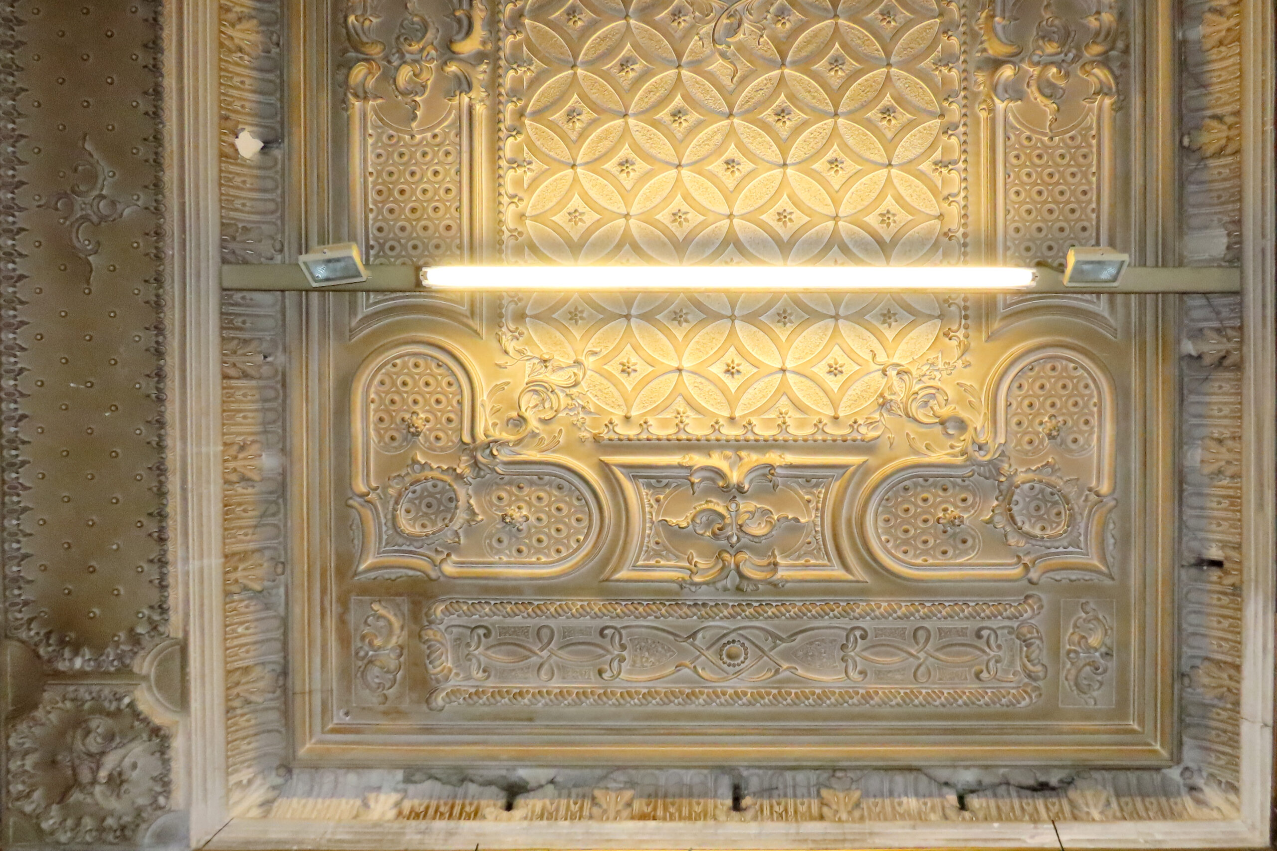The richly decorated plaster ceiling also dates from the late 19th century. Over the years, it has become heavily soiled and was further affected by nicotine, dating back to the time when cigars were still smoked in the former auction hall of Van Stockum.