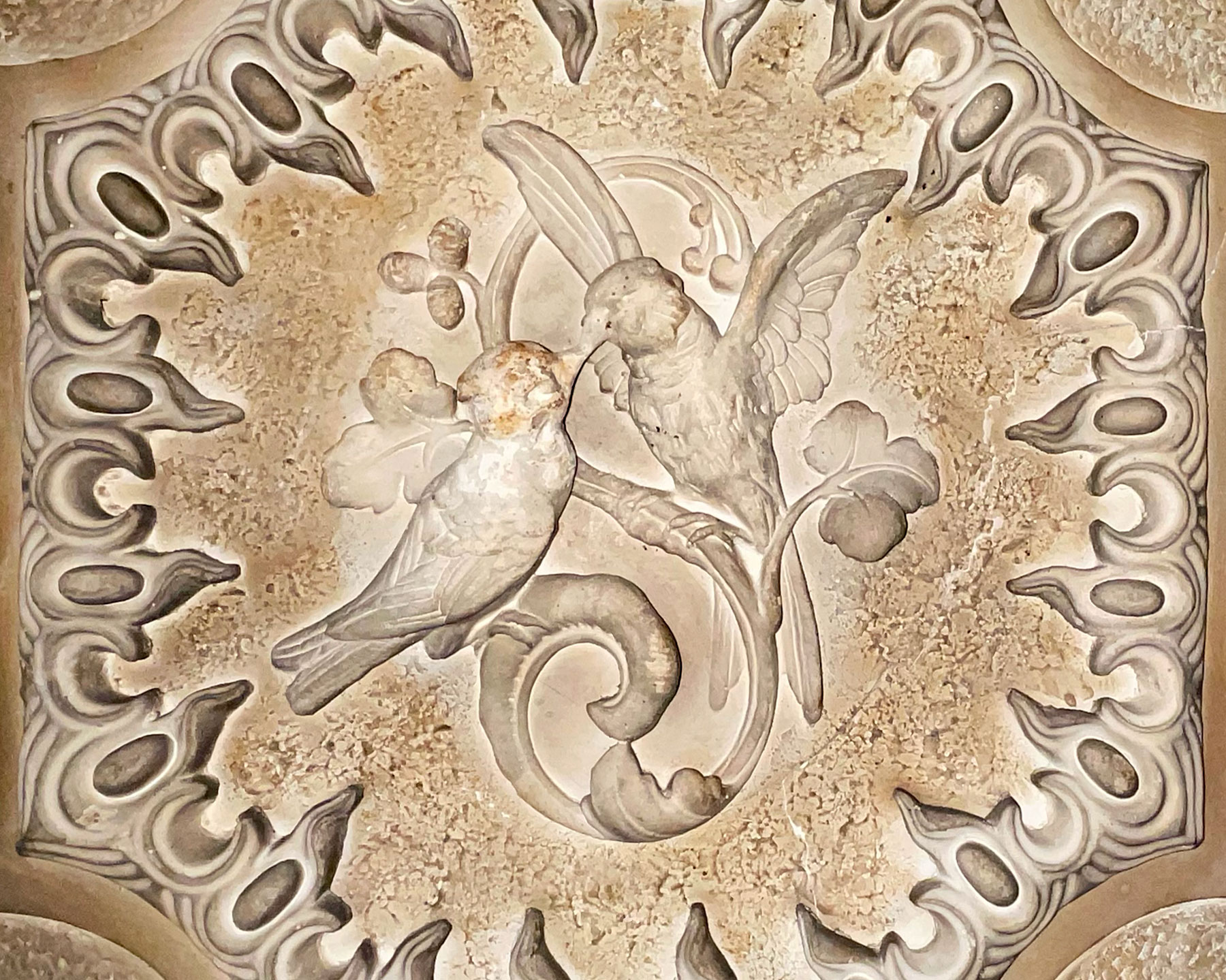 The first sections of the ceiling have now been cleaned, clearly revealing the contrast between the soiled and restored surfaces.