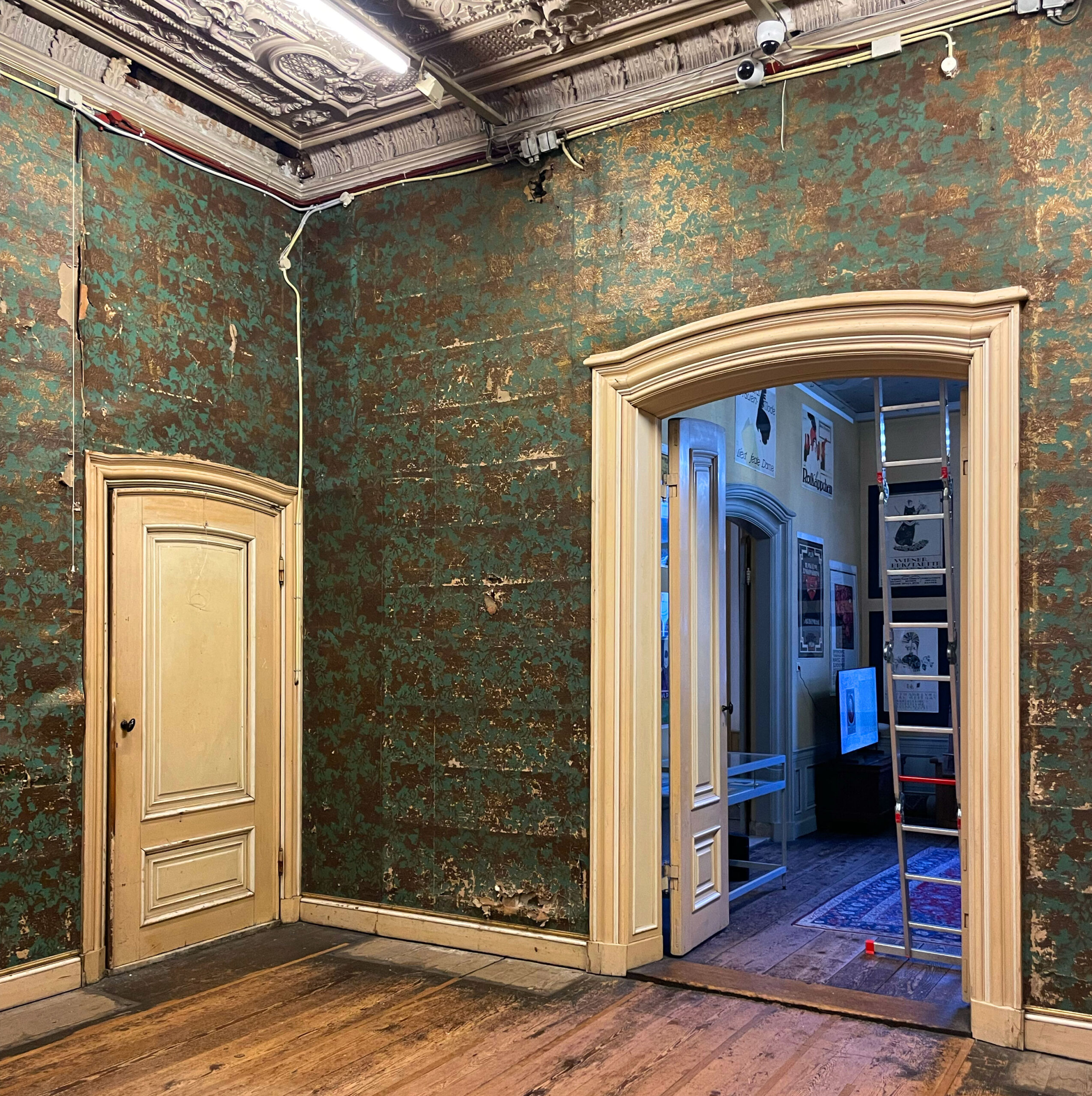 It is currently being restored by an experienced paper conservator who has previously worked on parts of this exceptional material. Thanks to this specialized approach, the wallpaper will soon be safely reinstalled.